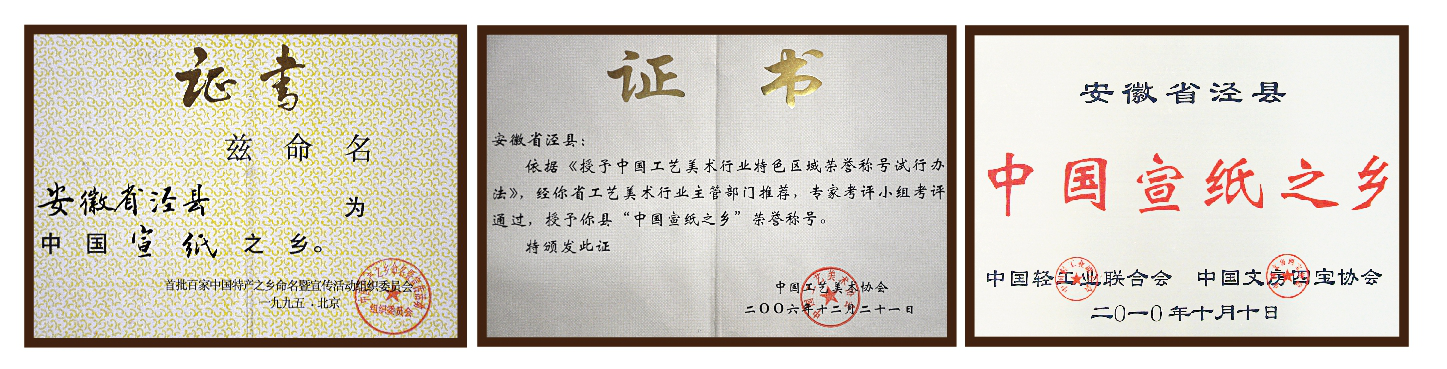 1995年,中國農(nóng)學會首次授牌認定涇縣為“中國宣紙之鄉(xiāng)”;2006年,中國工藝美術(shù)協(xié)會授予涇縣為“中國宣紙之鄉(xiāng)”;2010年,中國文房四寶協(xié)會授予涇縣為“中國宣紙之鄉(xiāng)”。宣紙之鄉(xiāng)的認定進一步確定了涇縣是中國宣紙正宗產(chǎn)地的地位。