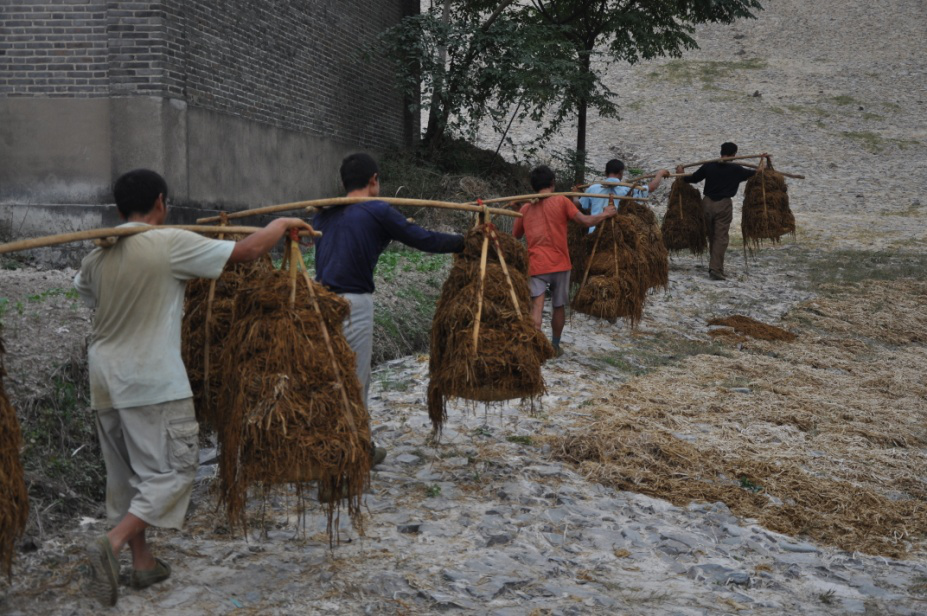 等草曬干后收回時(shí)將原塊四至五塊卷折成一大卷,堆放于干燥地點(diǎn)。