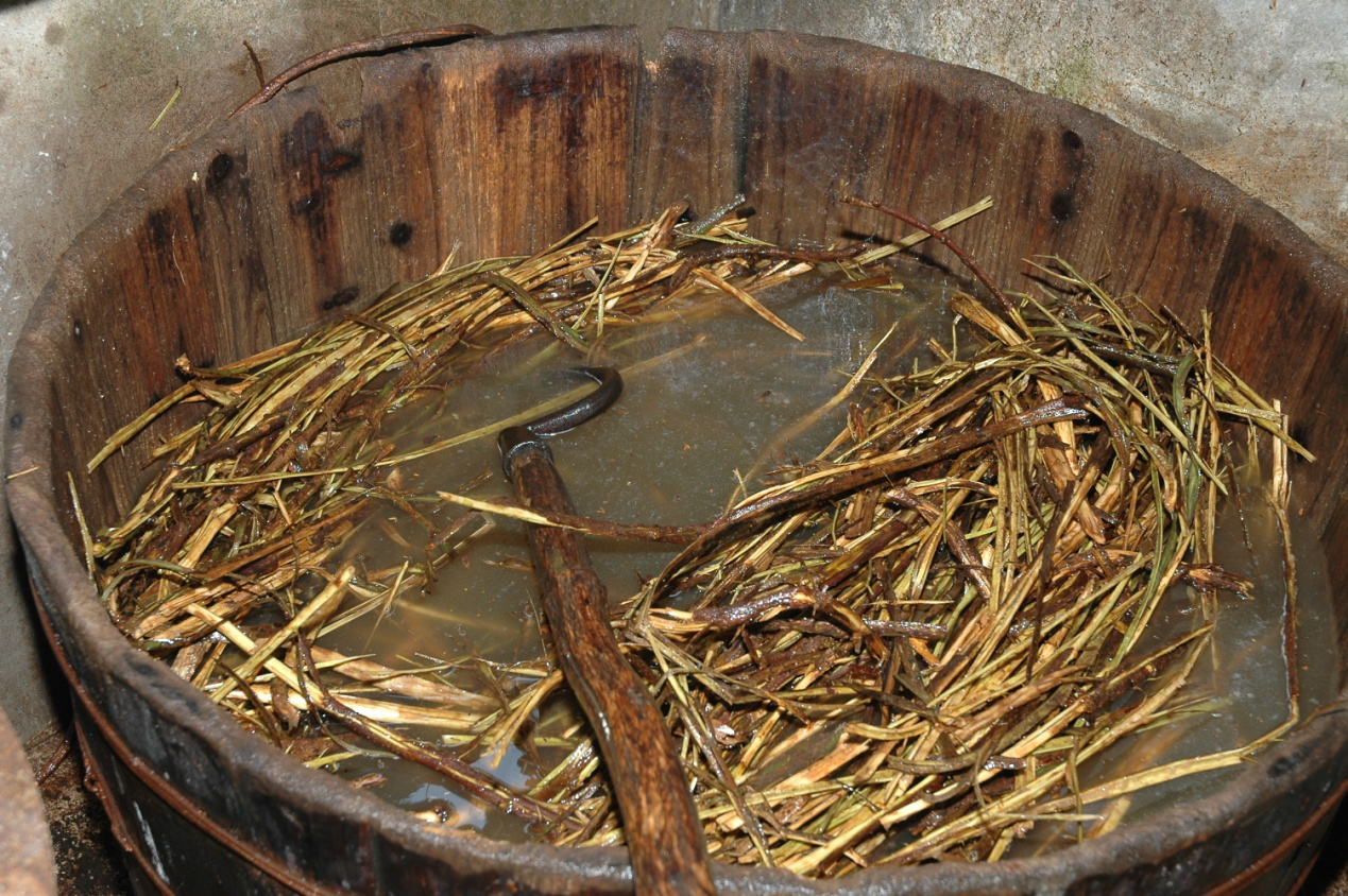 將適量的楊藤用手撅斷成等分長(zhǎng)短,用木槌錘破后全部浸泡池(桶)水中過(guò)夜,用彎鉤拉動(dòng),藥桶里的水牽絲后澄清用藥袋過(guò)濾到藥缸。