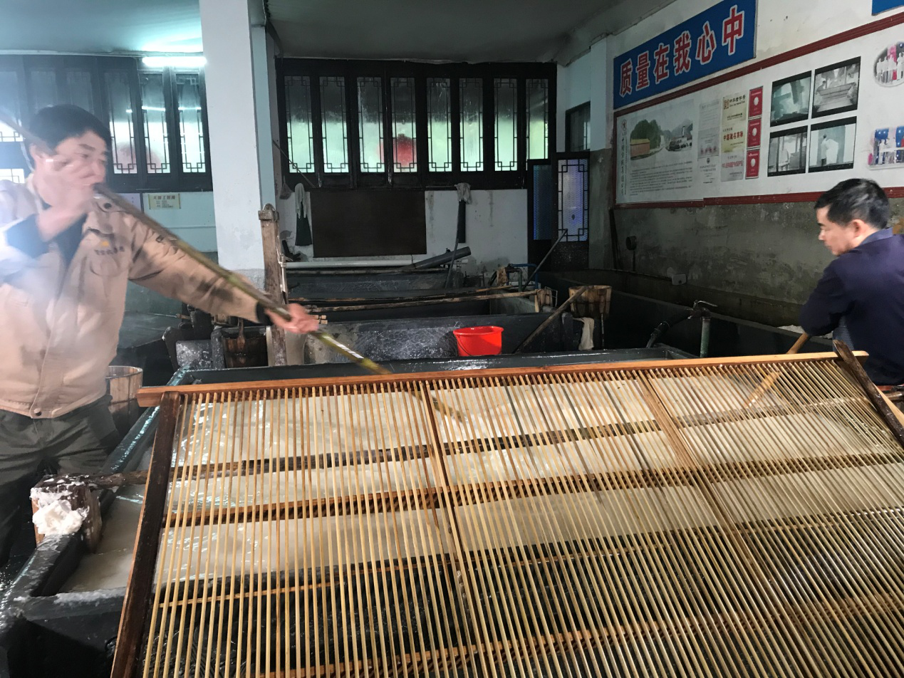 按槽口取料,將料放進(jìn)槽內(nèi)后,由撈紙?zhí)Ш煿づc劃槽工分站紙槽兩頭,人要站丁字步,身體稍向前傾,雙手持棍扒,左手在前撐穩(wěn),右手拉,其動(dòng)作像磨磨一樣,兩人套起來(lái)攪拌,紙料攪拌好后,摻入藥水,再用棍扒劃勻,以免藥花。