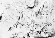 西方油畫中,也有偏于速寫意味的。油畫通常用色塊,普遍說來,與速寫的關(guān)系遠不及前述國畫之于速寫那樣密切。但印象派中莫奈的《日出印象》等油畫喜歡用短線,筆致散逸;而梵高油畫的筆觸,線條感最鮮明,形態(tài)更多樣,有的硬直,略如中國畫的刮鐵皴,有的扭轉(zhuǎn),則略似解索皴。這些油畫與他們的速寫情調(diào)一致,可謂“西方的文人畫”,與中國文人畫類同:都是詠物抒情、心性流淌的產(chǎn)物?!叭绻l在畫一棵柳樹的時候,把它看作是有生命的東西,并且只把自己的全部注意力集中在這棵樹上,直到賦予它某種生命為止,總會畫得富有生氣,周圍的事物于是也都跟著顯得有生氣了。”梵高這段話,不就是“萬物有靈,天人合一”嗎?“印象”二字與“寫意”,同樣可以互文。西斯萊也喜歡用撇和點,不過他的點厾常帶躁氣,逸味不足。蒙克的杰作《吶喊》也由線條組構(gòu)旋律,遺憾的是線條是“揩”出而非“寫”出,否則感染力將更深一層。