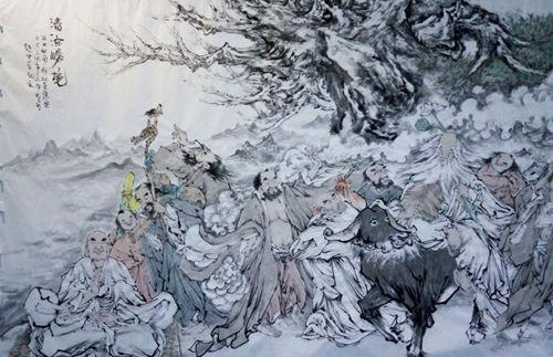 張偉覺圣老師以一個修行者的眼光和思維,以一個佛家信徒對佛學(xué)的精通和詮釋,對傳統(tǒng)的佛教題材的藝術(shù)元素加以歸納和總結(jié),予以改造和提升。由此,張老師寫意羅漢畫除了是一種藝術(shù)形式的表達(dá)外,更是一種精神靈地的守護(hù)。他的目標(biāo)是延續(xù)佛教題材中的羅漢畫法脈,讓隱沒在傳統(tǒng)里未能發(fā)揚光大的佛羅漢畫像在他的手中得以薪火相傳,擔(dān)當(dāng)著佛教文化傳承的使命,守護(hù)著盛世中國強勢文化中的非主流話語權(quán),讓其在人類社會精神體系中發(fā)揮著重要的作用?!?/p>