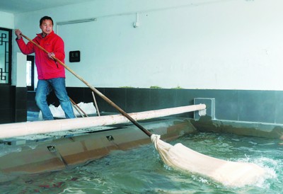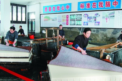 涇縣宣紙在上世紀50年代全縣只有四個槽,工人師傅們生產(chǎn)生活條件艱苦。上世紀50年代中葉,安徽省工藝美術(shù)大師、省勞動模范周乃空從部隊轉(zhuǎn)業(yè)分配到?jīng)芸h宣紙廠,分管生產(chǎn),他拜工人為師,利用開座談會的形式,把工人的發(fā)言記錄下來,整理出第一本宣紙生產(chǎn)操作規(guī)程。隨著宣紙生產(chǎn)規(guī)模的日益擴大,宣紙對外影響也日益彰顯。 1995年,涇縣被首批百家中國特產(chǎn)之鄉(xiāng)命名暨宣傳活動組委會命名為“中國宣紙之鄉(xiāng)”。 2002年,涇縣被國家批準為宣紙原產(chǎn)地域。 1992年,涇縣宣紙工業(yè)局、中國宣紙公司、涇縣宣紙廠合并,組建“中國宣紙集團公司”,2012年12月成功完成股份制改造,整體改制成立中國宣紙股份有限公司。 2013年,該公司宣紙產(chǎn)量首次突破700噸,同比增長4.5%,實現(xiàn)銷售收入22393萬元,增長17.7%,實現(xiàn)利稅10449萬元,增長18.7%,經(jīng)營效益大幅提升,生產(chǎn)經(jīng)營呈現(xiàn)出平穩(wěn)快速發(fā)展的良好勢頭?!?/p>