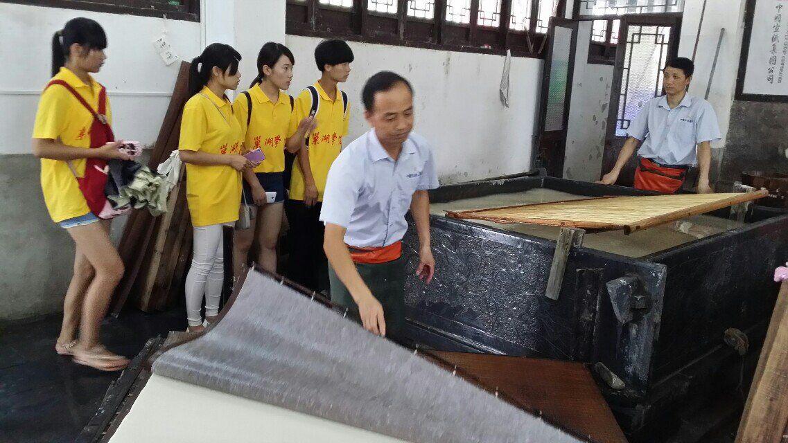 7月16日上午,團隊一行來到公司,與辦公室相關人員座談,參觀了宣紙文化產業(yè)園。團隊一行聽取了有關宣紙文化發(fā)展歷程及宣紙制作工藝方面的解說,團員們熱情地體驗了宣紙的制作過程。通過參觀體驗,同學們了解到宣紙是由青檀樹皮和沙田稻草等農產品制成,而僅沙田稻草的晾曬就需要8-10個月;宣紙的制作工序有100多道,因此從原材料生產,到最后的成品需花費近3年時間,紛紛感嘆宣紙制作工序的繁瑣和難度之大,宣紙生產工藝技巧絕妙,是智力與體力的完美結合,充分展現(xiàn)了我國手工造紙藝術的魅力。