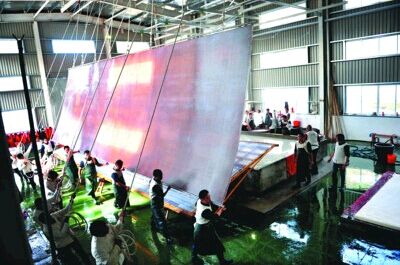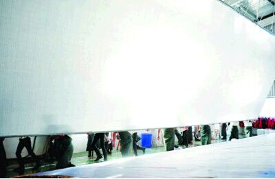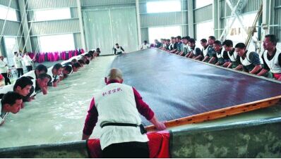 和著嘹亮的勞動號子,44名技藝精湛的漢子抬著長11.4米、寬3.6米的竹簾,整齊劃一地重復(fù)著撈紙動作,一簾水、二簾水。他們在紙漿槽里來回托挽兩次,屏息凝氣,靜待水從竹簾瀝下,紙漿便均勻而平坦地鋪在竹簾上。接著,一直站在槽邊的8名輔工拉緊繩子,竹簾應(yīng)聲而起。隨著龍門吊上的滑輪轉(zhuǎn)動,大家護(hù)送紙簾到上帖區(qū),整個過程一氣呵成,莊嚴(yán)而神圣。