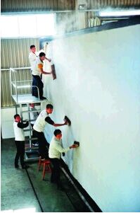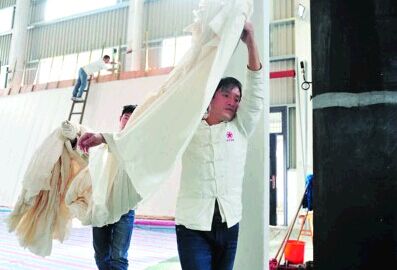 紙?zhí)希垙埛e累到150張時,工人將紙?zhí)У胶娓蓞^(qū)。紙烘干到一定程度,8個牽紙工騎在木梯上,從兩頭往中間小心翼翼將紙一張張撕下,送往曬紙區(qū)。曬紙區(qū)高溫墻兩側(cè)各有6人,分上中下三個部位,用紙刷將濕漉漉的紙刷上高溫墻,水汽瞬間升騰而起。當(dāng)紙張漸漸變硬,工人再細(xì)致地卷起,將其送到檢驗區(qū),檢驗女工從頭到尾細(xì)致觀察,剔除次品,然后裁剪成統(tǒng)一規(guī)格,一張尺寸達(dá)11米×3.3米的“超級宣紙”才算真正完成,可以蓋上印章封存起來。