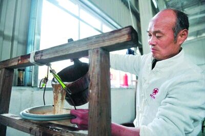 宣紙制作中需要將楊藤踩成汁作為藥水加入紙漿