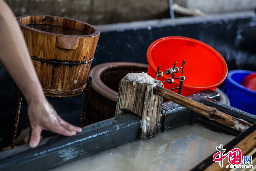 水槽中的紙漿是“嬌氣”的,錯(cuò)過(guò)最佳時(shí)間,便會(huì)沉淀、變質(zhì),也就無(wú)法做出一張完美的宣紙。所以在撈紙的過(guò)程中要不斷的攪拌水槽里的紙漿。