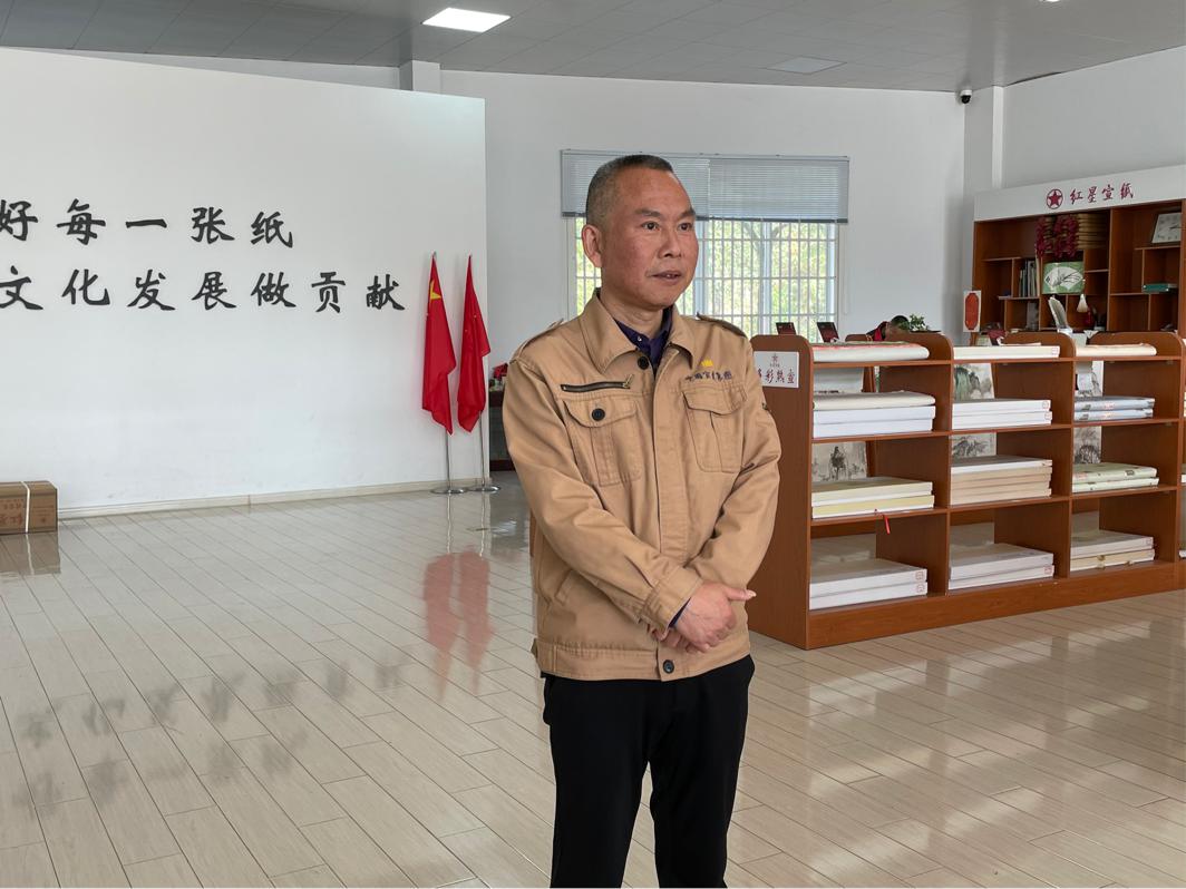 ??中國宣紙股份有限公司副總經(jīng)理黃迎福接受媒體采訪。(未來網(wǎng)記者凌萌 攝)