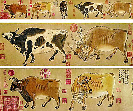 ??現(xiàn)存于故宮博物院的晉代展子虔所創(chuàng)作的《游春圖》是現(xiàn)存古代書畫作品中最早的作品之一,其畫心為絹本,其命紙為純青檀皮料宣紙,經(jīng)相關(guān)機構(gòu)用現(xiàn)代手段測試,斷定此宣紙是唐代中期的實物;唐代韓滉創(chuàng)作的《五牛圖》的畫心為桑皮紙,命紙為純青檀皮宣紙。這兩種實物表明,宣紙制作技藝的雛形在唐代已經(jīng)具存。