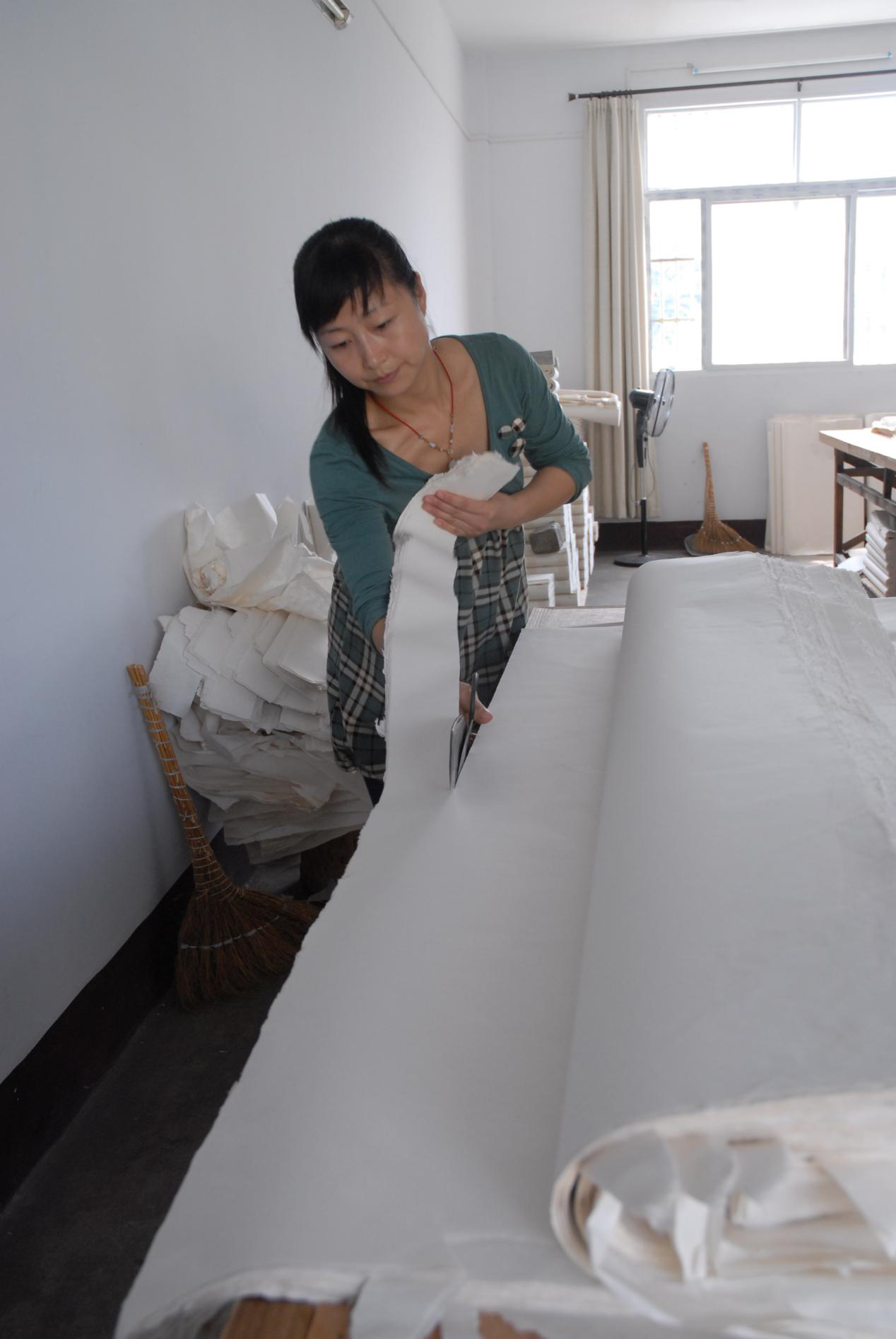 宣紙制作最后一道工序?yàn)闄z驗(yàn),也被稱為剪紙。在檢驗(yàn)之前,先將曬好的宣紙數(shù)一下張數(shù),登記數(shù)據(jù),與檢驗(yàn)后的成品紙相比,可得出成品率。