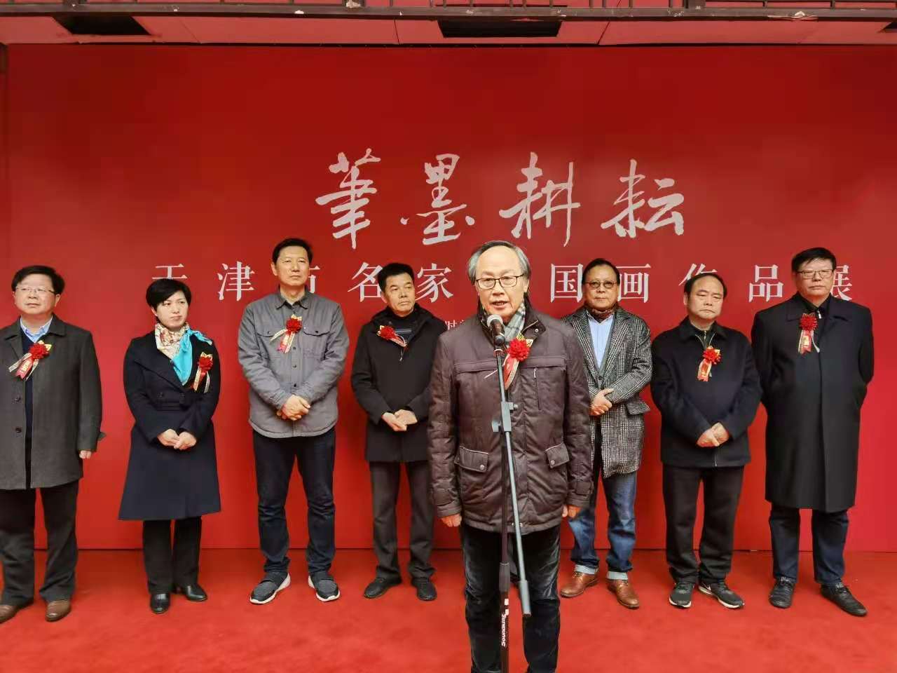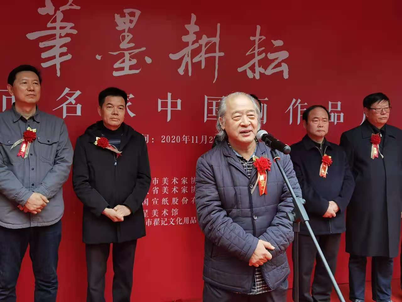 中國美協(xié)副主席、天津市文聯(lián)副主席、天津市美協(xié)主席王書平作了熱情洋溢的講話。他指出,正值全國人民認(rèn)真學(xué)習(xí)貫徹十九屆五中全會(huì)精神之際,我們在這里舉辦“筆墨耕耘——天津市名家中國畫作品展”,要感謝各個(gè)方面對展覽給予的巨大支持,并向展覽的隆重開幕表示最熱烈的祝賀。他表示,走進(jìn)這片紅色的大地、文化的熱土,令人心潮澎湃、熱血沸騰。這里走出了許許多多的革命老前輩、革命先烈,也培育出了許許多多的著名藝術(shù)大師、書畫名家,來到這里才真正體會(huì)到為什么中國畫會(huì)產(chǎn)生這么大的魅力、凝聚力和感召力。中國畫的墨分五色和濃淡干濕,意境美、氣韻美,筆墨的堅(jiān)守與創(chuàng)新,都要感謝涇縣的宣紙文化,仍然堅(jiān)持著傳統(tǒng)制作技藝,為中國畫的創(chuàng)作提供了一個(gè)展示的平臺,對中國畫的發(fā)展作出了不可磨滅的貢獻(xiàn)。人民群眾不僅是中國畫的鑒賞者、欣賞者,更是評判者,所以我們來到這里,用作品向安徽、向宣城、向涇縣人民來匯報(bào)。今后安徽和天津兩地的美術(shù)家,要更多地進(jìn)行美術(shù)交流,真正走進(jìn)生活、走進(jìn)人民,做到對實(shí)用生活的身入、情入和心入。衷心祝愿兩地的美術(shù)家和美術(shù)工作者們,拿起手中的畫筆,帶著對祖國和對人民的摯愛,在涇縣的宣紙上,為新時(shí)代揮毫潑墨,為新時(shí)代描繪畫卷,以新的更精彩的作品向祖國匯報(bào),向人民匯報(bào)。