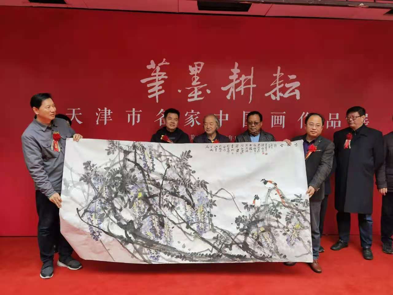 出席開幕式的天津名家每人向中國宣紙博物館捐贈(zèng)一幅作品,并由10位畫家合作了一幅八尺巨作捐贈(zèng)給中國宣紙博物館。中國美協(xié)副主席、天津市文聯(lián)副主席、天津市美協(xié)主席王書平代表參展畫家向中國宣紙博物館捐贈(zèng)作品,胡文軍董事長接受捐贈(zèng)。天津市美協(xié)主席團(tuán)成員、駐會(huì)秘書長張福有代表參展畫家捐贈(zèng)合作作品,朱大國總經(jīng)理接受捐贈(zèng)。