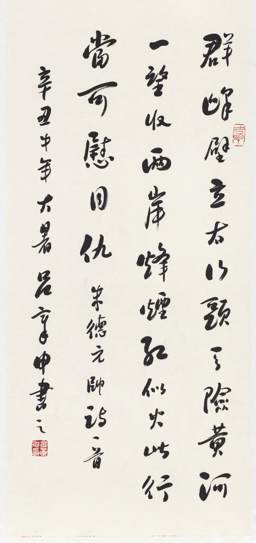 呂章申 朱德元帥詩一首100×50厘米釋文:群峰壁立太行頭,天險黃河一望收。兩岸烽煙紅似火,此行當可慰同仇。創(chuàng)作年代:2021年