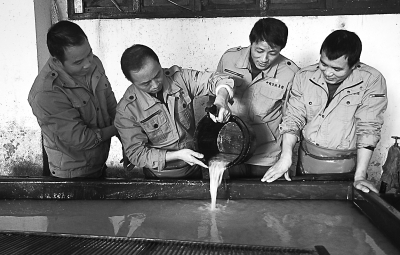 “一開始當撈紙工,我前兩個月沒完成任務。只掙到十幾塊錢,基本等于白干。宣紙廠采取計件工作制,每天工作定額是800張合格紙,只有下限,不設上限。因為我技術(shù)動作不熟練,廢品率就高。要么是從水槽撈出的紙張厚薄不均(導致分量不夠標準),要么是紙上有水皺(皺褶)、水泡(鼓泡)或水洞(窟窿)。出師不利,我才知道,跟以前自己下地種田插秧不同,撈紙可不是那么容易的事。這里面還真有些高深的門道呢?!?br/> 產(chǎn)品不合格怎么辦?
