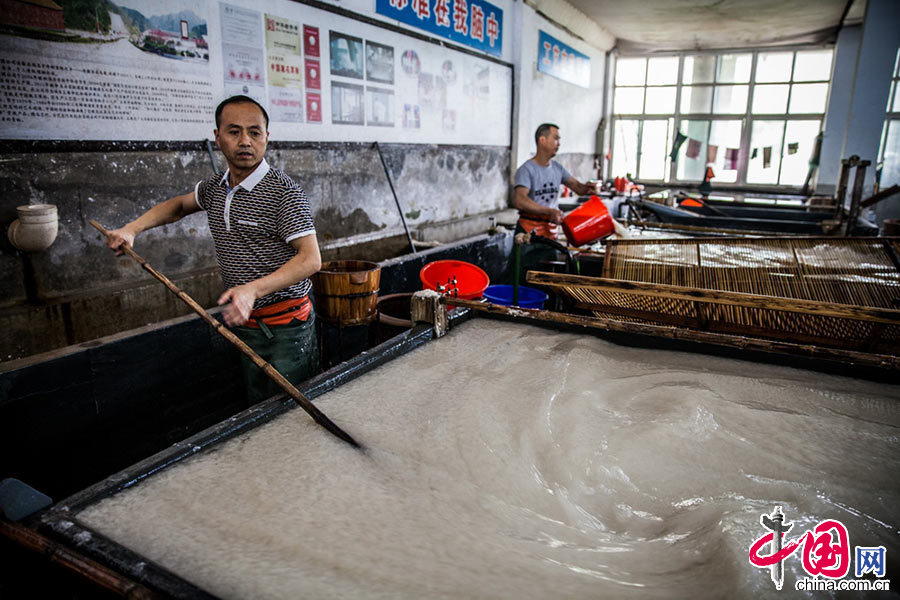 水槽中的紙漿是“嬌氣”的,錯(cuò)過(guò)最佳時(shí)間,便會(huì)沉淀、變質(zhì),也就無(wú)法做出一張完美的宣紙。所以在撈紙的過(guò)程中要不斷的攪拌水槽里的紙漿。